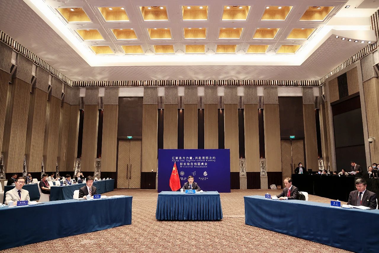 5月20日,“匯聚各方力量,共赴昆明之約”部長級在線圓桌會議在上海舉行。生態環境部部長黃潤秋主持會議并致辭。聯合國常務副秘書長阿明娜·穆罕默德,來自巴西、哥倫比亞、哥斯達黎加、埃及、埃塞俄比亞、歐盟、德國、印度、日本、新加坡的10位部長級代表,以及聯合國開發計劃署、環境規劃署、糧農組織、教科文組織、《生物多樣性公約》(以下簡稱《公約》)秘書處、《防治荒漠化公約》秘書處、《氣候變化框架公約》秘書處等國際組織的代表岀席會議并在線或視頻發言。