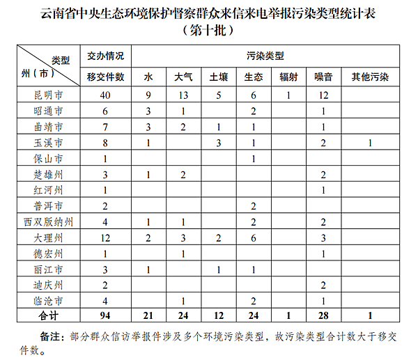 5月19日,中央第七生態環境保護督察組向云南移交第十批群眾信訪舉報件94件,其中來電舉報59件,來信舉報35件。從信訪舉報件生態環境問題污染類型來看,涉及水21件、大氣24件、土壤12件、生態24件、輻射1件、噪音28件、其他污染1件。從區域分布上看,昆明市40件、昭通市6件、曲靖市7件、玉溪市8件、保山市1件、楚雄州3件、紅河州1件、普洱市2件、西雙版納州4件、大理州12件、德宏州1件、麗江市3件、迪慶州2件、臨滄市4件。截至當日,云南省已累計收到中央第七生態環境保護督察組交辦的信訪舉報件771件,所有舉報件均已及時轉交相關州(市)處理。
