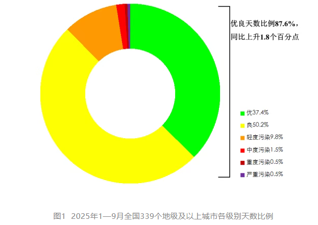 1—9月,全國339個地級及以上城市平均空氣質量優良天數比例為87.6%,同比上升1.8個百分點;平均重度及以上污染天數比例為1.1%,同比持平。由沙塵天氣導致的平均超標天數比例為3.1%,其中重度及以上污染天數比例為0.7%。