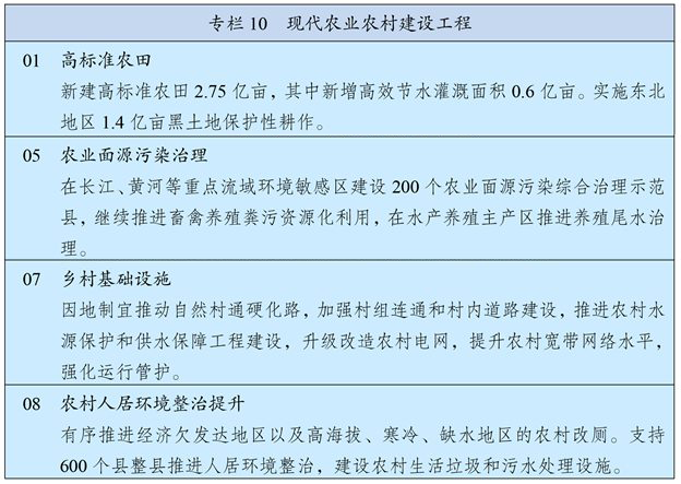 夯實糧食生產能力基?。U狹?、棉、油、糖、肉、奶等重要農產品供給安全。堅持最嚴格的耕地保護制度,強化耕地數量保護和質量提升,嚴守18億畝耕地紅線,遏制耕地“非農化”、防止“非糧化”,規范耕地占補平衡,嚴禁占優補劣、占水田補旱地。以糧食生產功能區和重要農產品生產保護區為重點,建設國家糧食安全產業帶,實施高標準農田建設工程,建成10.75億畝集中連片高標準農田。實施黑土地保護工程,加強東北黑土地保護和地力恢復。