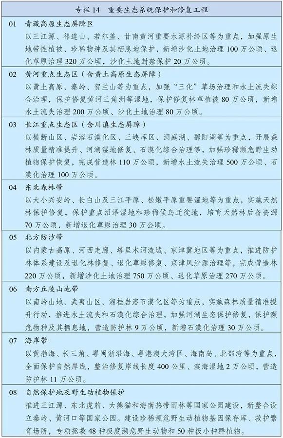 強化國土空間規劃和用途管控,劃定落實生態保護紅線、永久基本農田、城鎮開發邊界以及各類海域保護線。以國家重點生態功能區、生態保護紅線、國家級自然保護地等為重點,實施重要生態系統保護和修復重大工程,加快推進青藏高原生態屏障區、黃河重點生態區、長江重點生態區和東北森林帶、北方防沙帶、南方丘陵山地帶、海岸帶等生態屏障建設。加強長江、黃河等大江大河和重要湖泊濕地生態保護治理,加強重要生態廊道建設和保護。全面加強天然林和濕地保護,濕地保護率提高到55%。科學推進水土流失和荒漠化、石漠化綜合治理,開展大規模國土綠化行動,推行林長制。科學開展人工影響天氣活動。推行草原森林河流湖泊休養生息,健全耕地休耕輪作制度,鞏固退耕還林還草、退田還湖還濕、退圍還灘還海成果。