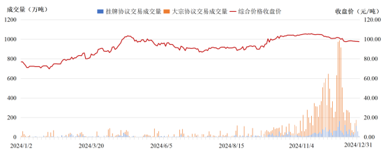 根據《2023、2024年度全國碳排放權交易發電行業配額總量和分配方案》,納入全國碳排放權交易市場2023年度配額管理的發電行業重點排放單位共計2096家,年覆蓋二氧化碳排放量約52億噸,市場共運行242個交易日。截至2024年底,全國碳排放權交易市場配額累計成交量6.3億噸,累計成交額430.33億元。其中2024年全年配額成交量1.89億噸,成交額181.14億元,交易規模持續擴大。交易價格穩中有升,年底收盤價為97.49元/噸,較2023年底上漲22.75%。配額清繳完成情況趨好,2023年度配額應清繳總量52.44億噸,配額清繳完成率約99.98%。