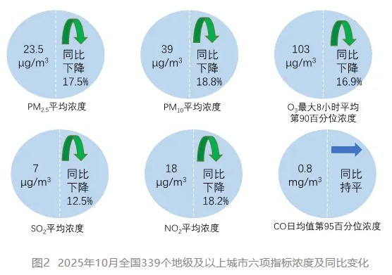 10月,全國339個地級及以上城市PM2.5平均濃度為23.5微克/立方米,同比下降17.5%;PM10平均濃度為39微克/立方米,同比下降18.8%;O3平均濃度為103微克/立方米,同比下降16.9%;SO2平均濃度為7微克/立方米,同比下降12.5%;NO2平均濃度為18微克/立方米,同比下降18.2%;CO平均濃度為0.8毫克/立方米,同比持平。