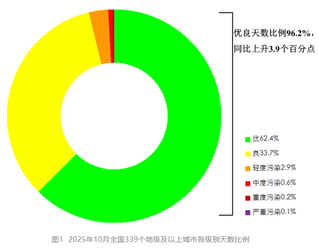 10月,全國339個地級及以上城市平均空氣質量優良天數比例為96.2%,同比上升3.9個百分點;平均重度及以上污染天數比例為0.3%,同比上升0.1個百分點。由沙塵天氣導致的平均超標天數比例為0.9%,其中重度及以上污染天數比例為0.1%。